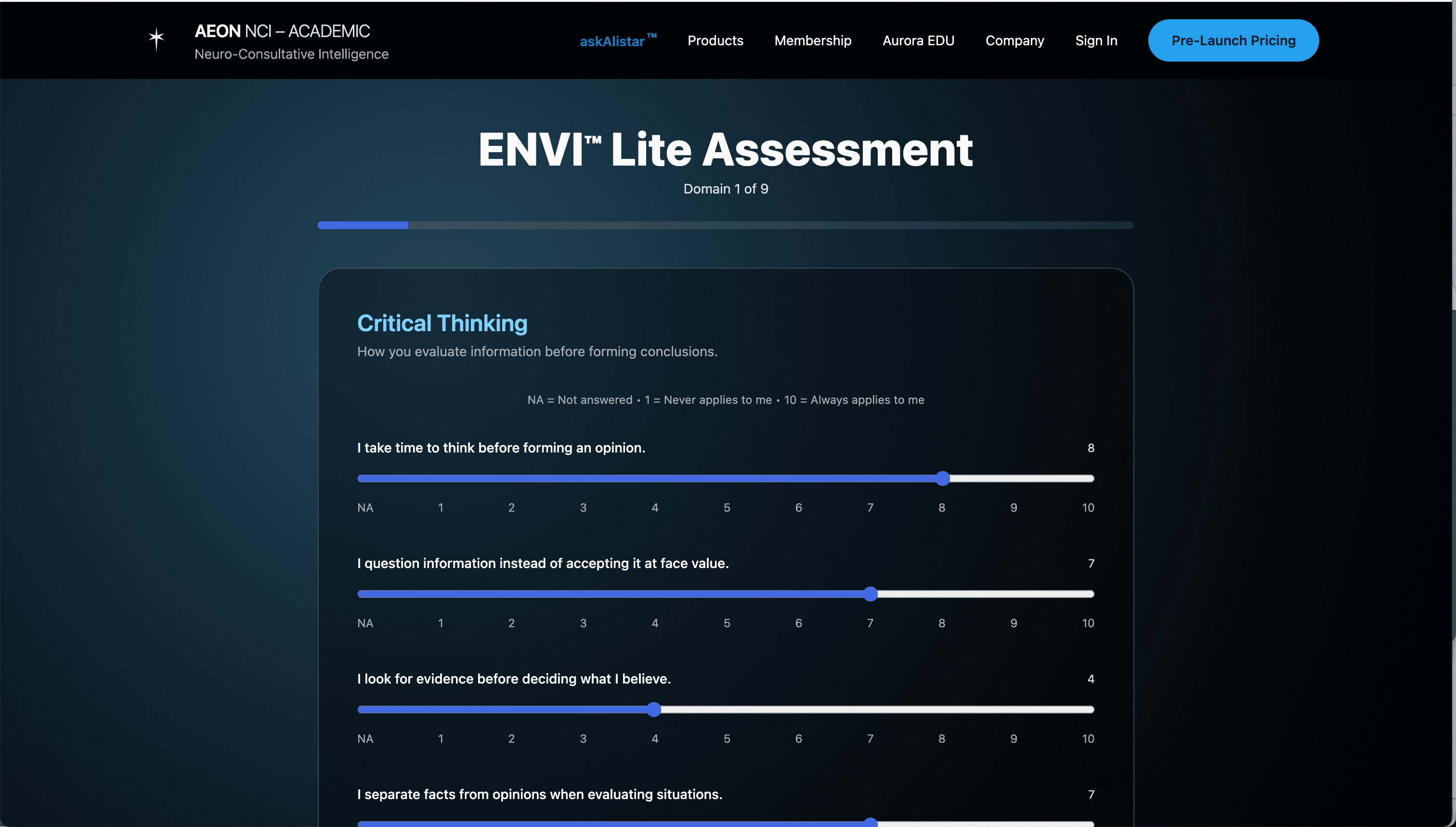 AEON Genesis™ develops how entrepreneurs think through decisions across the areas that most often determine success or failure. Rather than giving answers, Genesis strengthens judgment, trade-off awareness, and confidence under uncertainty aligned to your ENVI™ Decision Archetype.